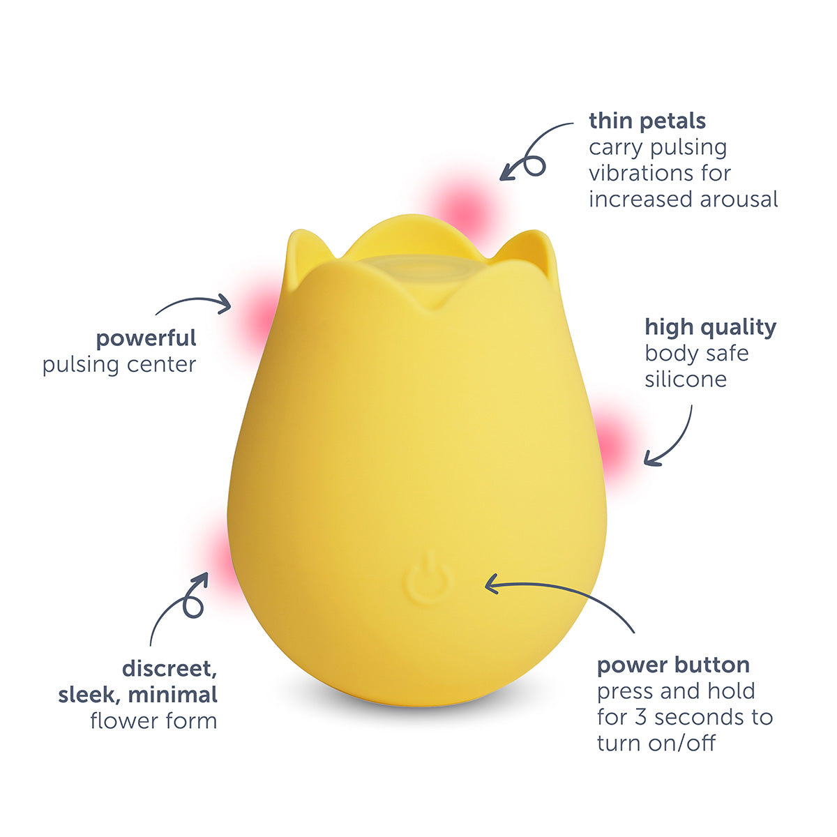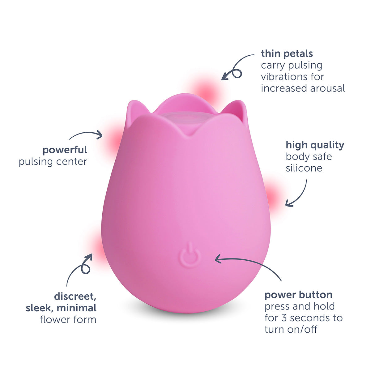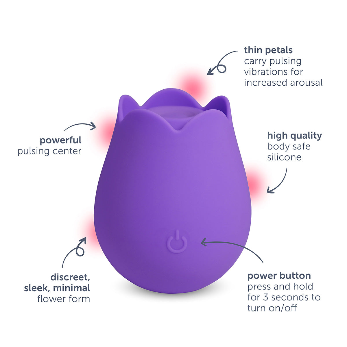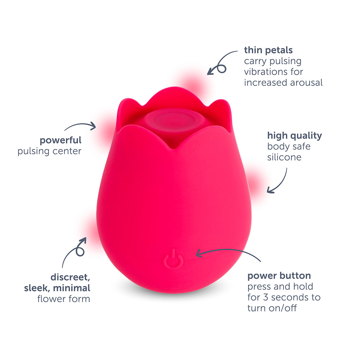Self-love is in bloom with the plusOne® rose arouser. This external vibrator offers strong pulsing stimulation and light fluttering stimulation at the same time. The sleek, minimal flower form provides a comfortable grip while the petals carry vibrations for fluttering sensations. Explore your erogenous zones with the pulsing surface and teasing petals. The motor on this rose vibrator has 10 different vibration settings, allowing you to choose what suits you at the moment, from gentle vibing to more intense pulsing.